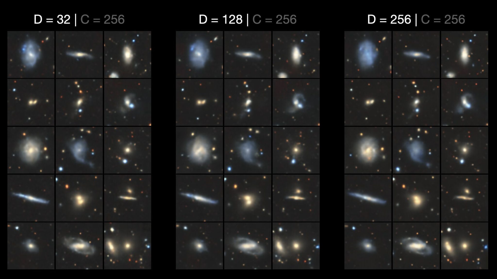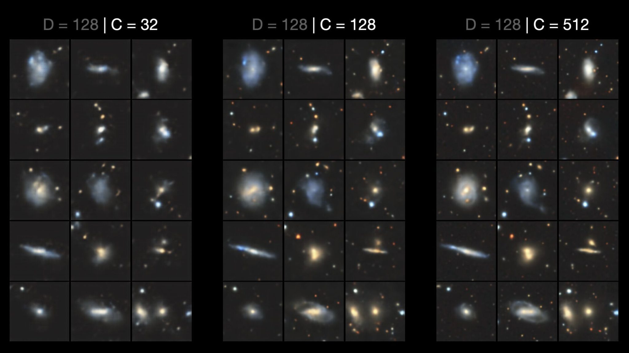 We chose to train the conditional prior on the original morphological class labels, but there is nothing to stop us from conditioning on other labels, perhaps even incorporating physical properties such as stellar mass, star formation rate and Sersic indices. Of course, since that would be a type of continuous conditioning, where the class labels are no longer discrete integers, you’d have to use a sinusoidal or Fourier-based embedding (like in neural radiance fields) rather than the linear/discrete nn.Embedding we used. If there is indeed a correlation, a conditional prior should reveal it (assuming a suitably powerful VQ-VAE).