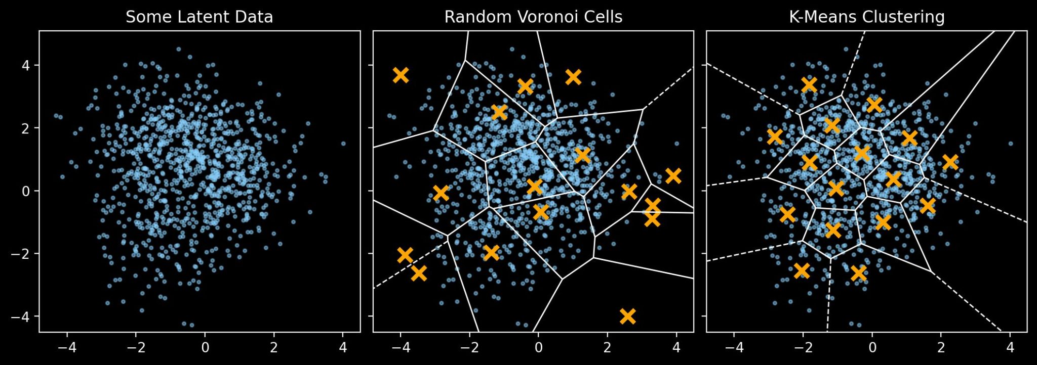 For this example we have some randomly distributed data created with scikit-learn’s make_blobs. The central panel shows a set of randomly-chosen points and their Voronoi tesselation. The right panel shows a different Voronoi tesselation, this time with points chosen via the K-means clustering algorithm (not to be confused with the k-nearest neighbour algorithm). Here the region is partitioned into Voronoi cells such that each data point belongs to the cell with the closest mean, and that the variance of points within each cluster is minimised.