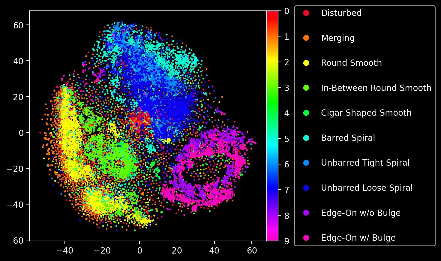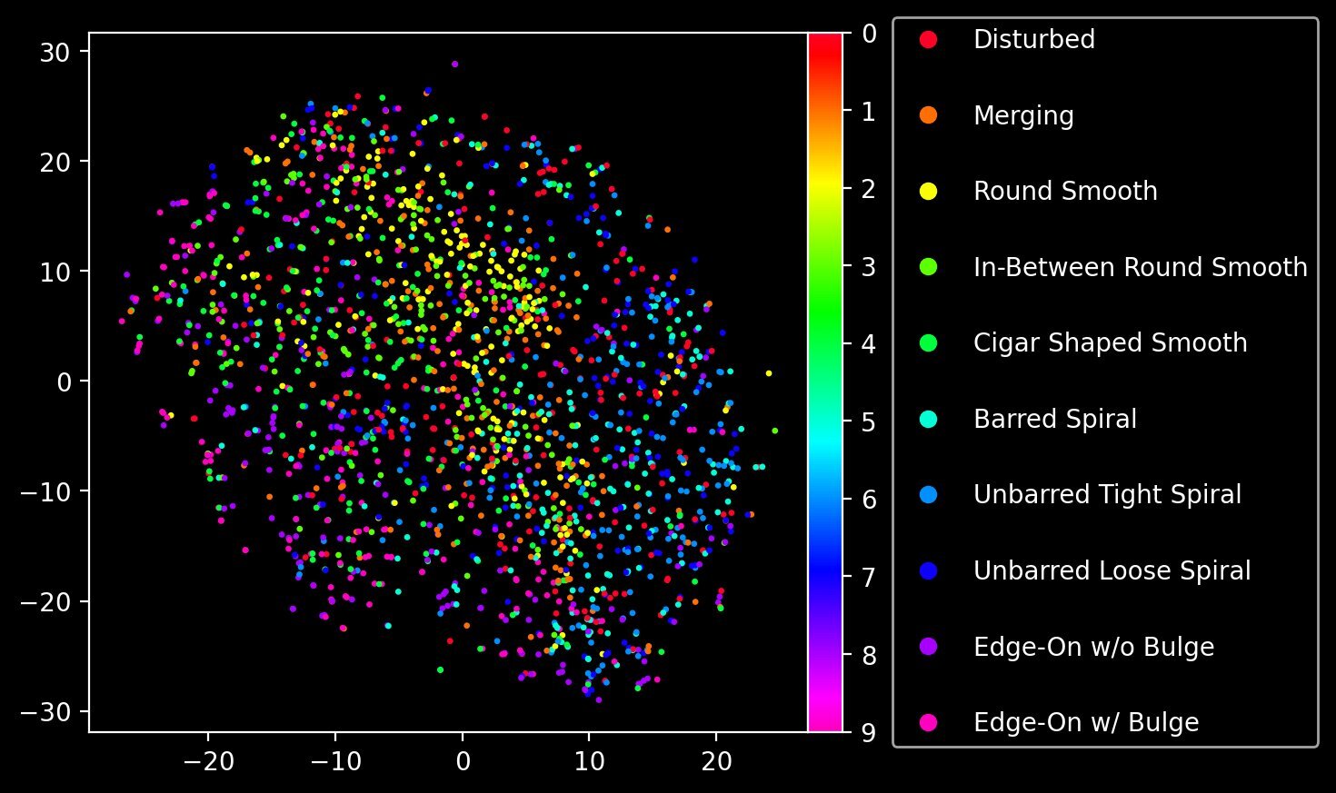 Now that we have a prior, we can effectively generate as many new images of galaxies as we want, for a given input class label. Yet do these images retain a semblance of structure? We saw in the purely unsupervised VQ-VAE that the latent space, when reduced to a 2D plane with t-SNE, was able to separate different morphological types fairly well. Has the conditional prior also managed to capture this latent representation? We can check this out by performing the same t-SNE dimensionality reduction procedure, but this time on the actual quantized codebook vectors that correspond to the sequences of codebook indices generated by our conditional transformer prior (this is why we also return quantized in our generate function!)