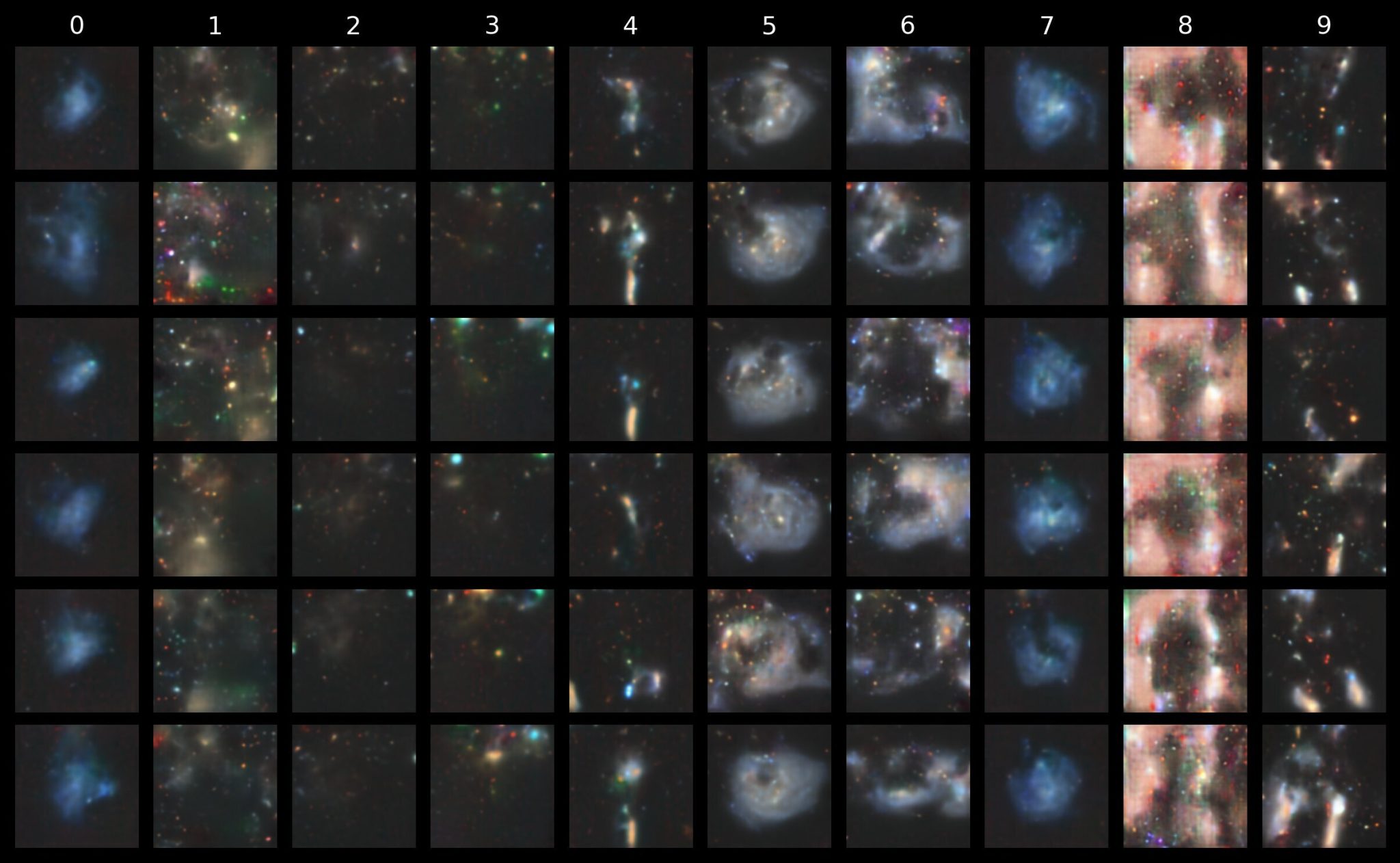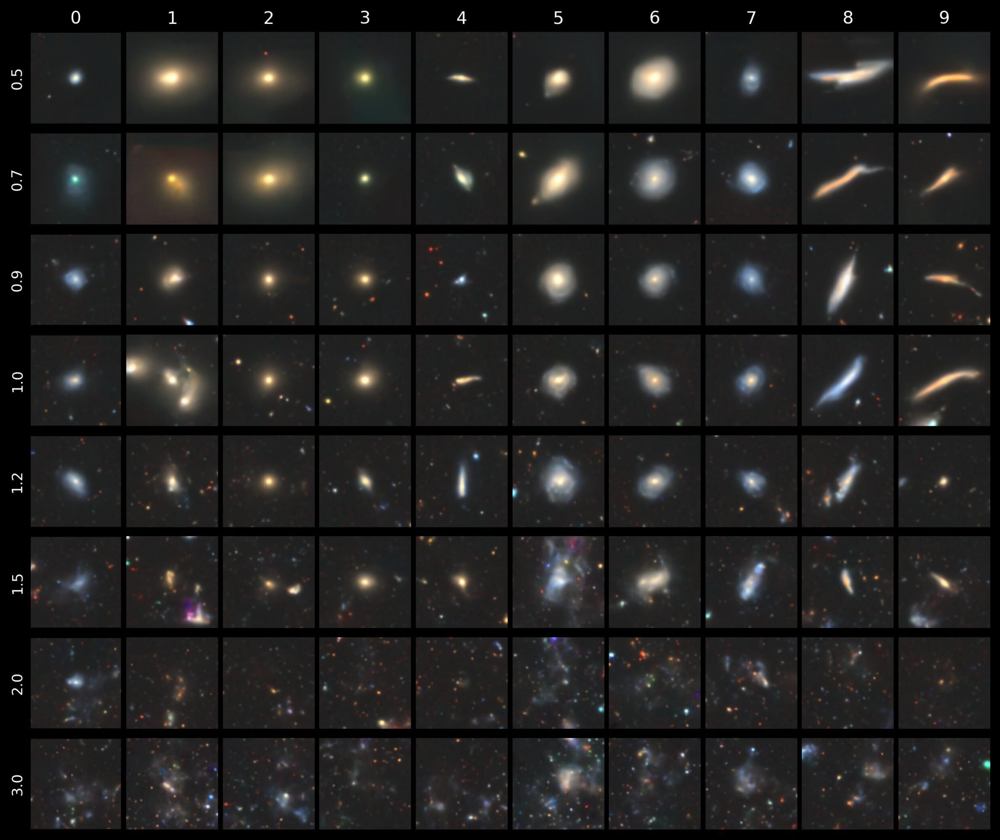 And now here’s one for conditional images (cfg_scale = 3). To save you scrolling back up to the start, the morphological classes from 0 to 9 are “disturbed”, “merging”, “round smooth”, “in-between round smooth”, “cigar shaped smooth”, “barred spiral”, “unbarred tight spiral”, “unbarred loose spiral”, “edge-on without bulge” and “edge-on with bulge”.