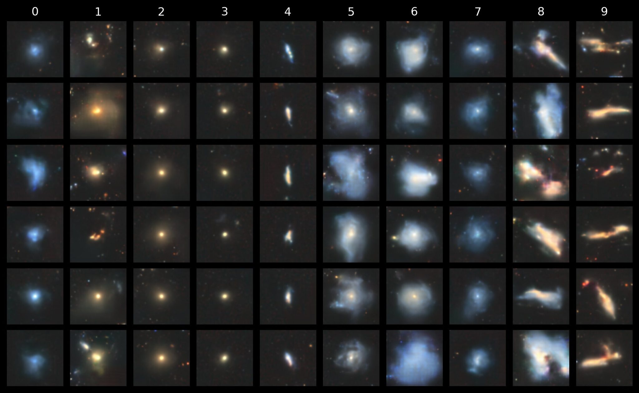 You might think the outcome illustrated above is only possible because we used a conditional transformer prior trained with CFG. While class conditioning certainly makes visualising the different morphologies easier, the fact remains that the original sequences of indices (i.e. the training data for the prior) were generated from the VQ-VAE’s vector quantizer: an unsupervised model. The VQ-VAE has done the heavy lifting in obtaining a latent codebook representation of the Galaxy10 dataset. The conditional transformer prior then gives us the power to interpret (and eventually emulate) the latent space of the codebook by autoregressively training on the sequences of codebook indices. It is that step that can optionally benefit by conditioning on class labels. The base VQ-VAE is entirely unsupervised.